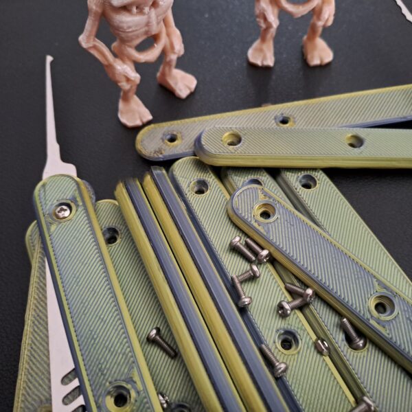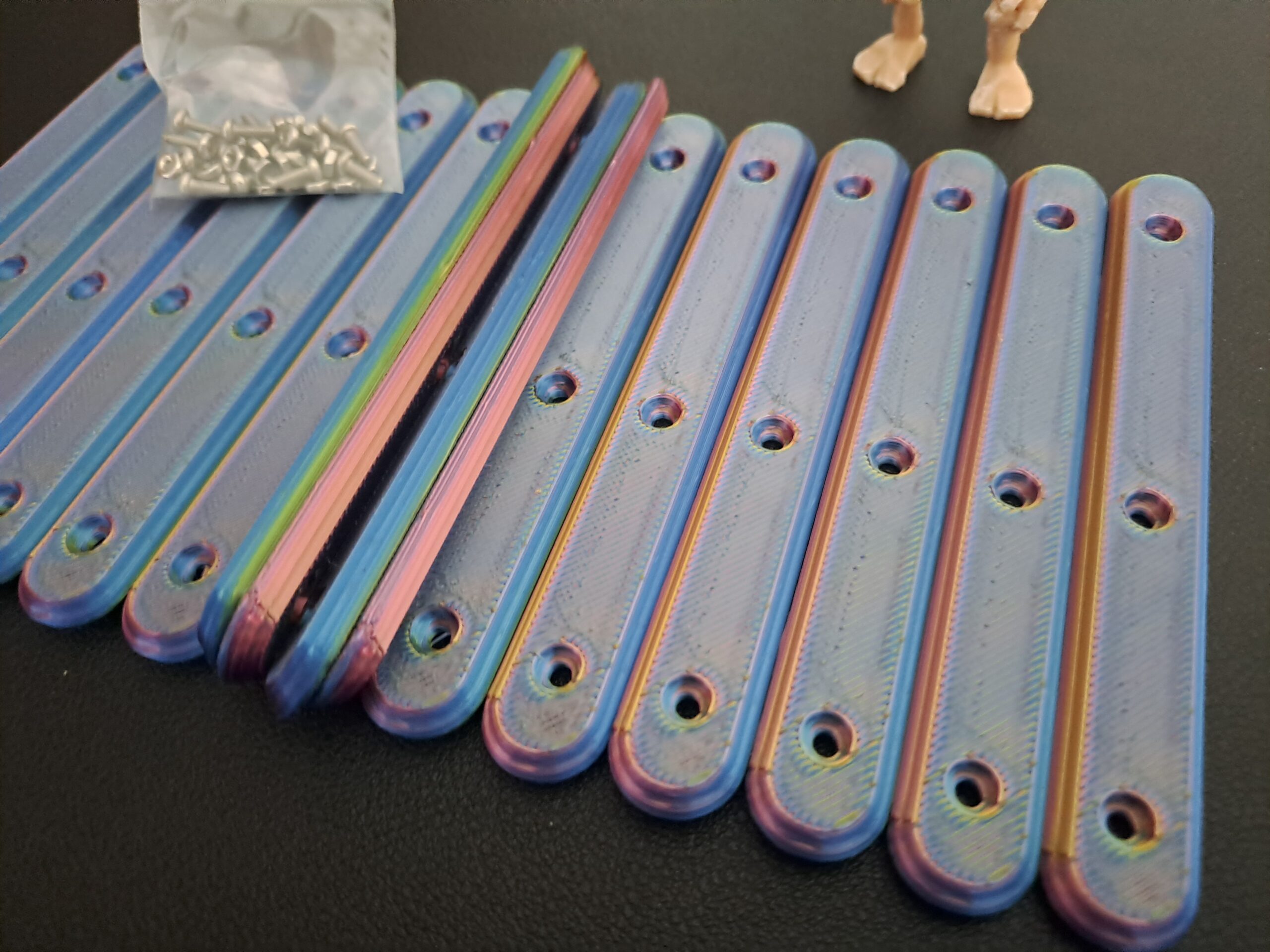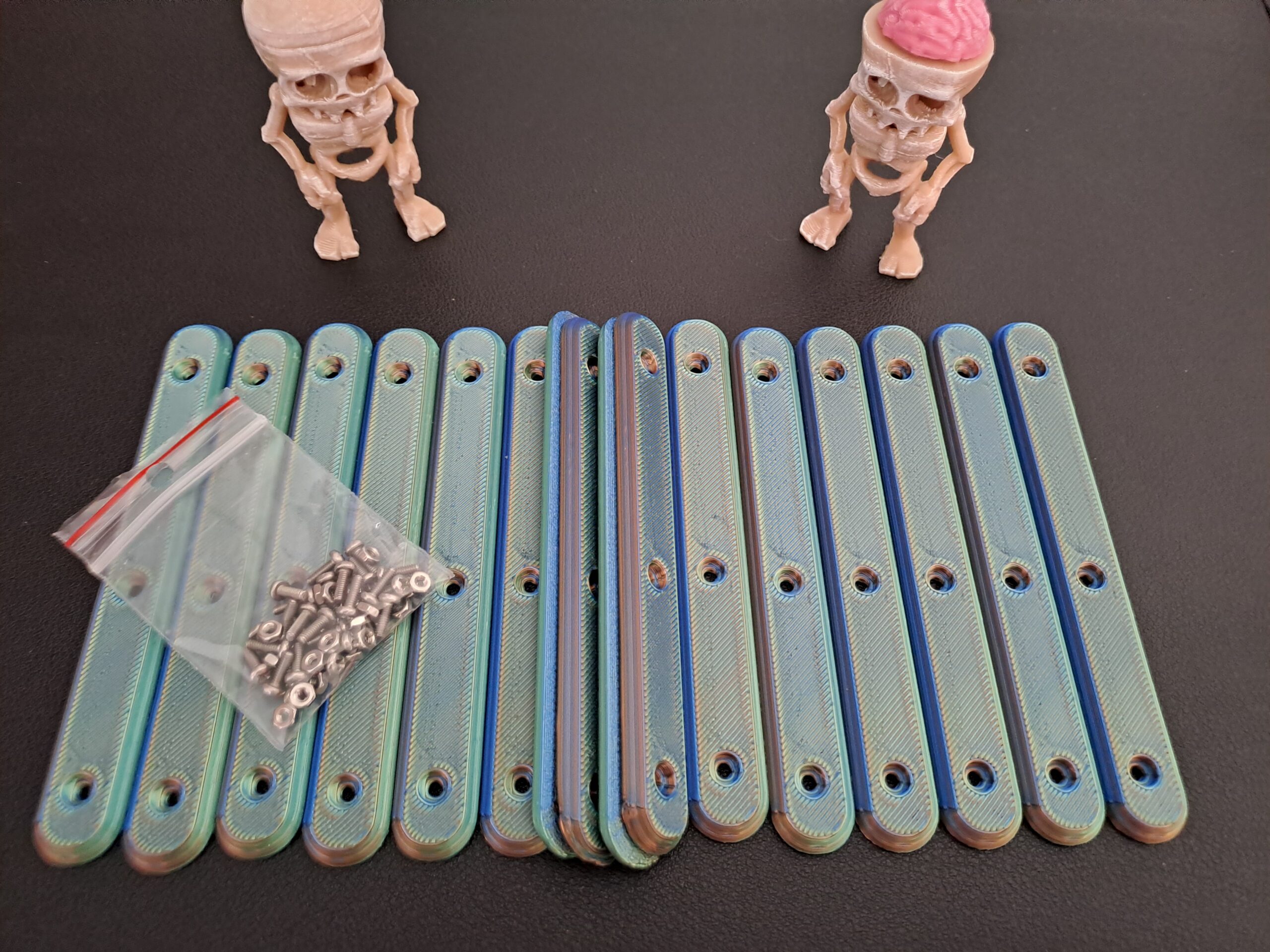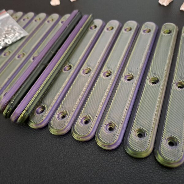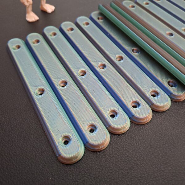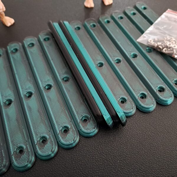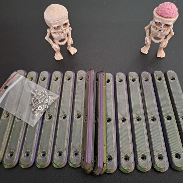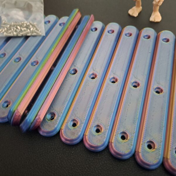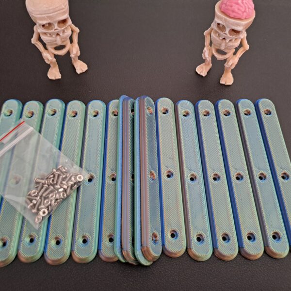 Multi-Coloured ‘Silk’ 8 pack version of the ‘Bone-Grip’ reusable handles. Each set combines two part colour combinations which interleave through the whole handle . Supplied with 24 x M2 6mm bolts and 24 x m2 nuts are included.