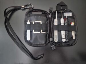 This case does a wonderful job of holding the different sized products. There are large pouches in the back, medium sized dividers behind the elastic strap and smaller dividers on top of the elastic. I wish the large pouches were a hair wider to fit my mechanical pick gun, but it’s probably for the best; I need to build better picking habits.